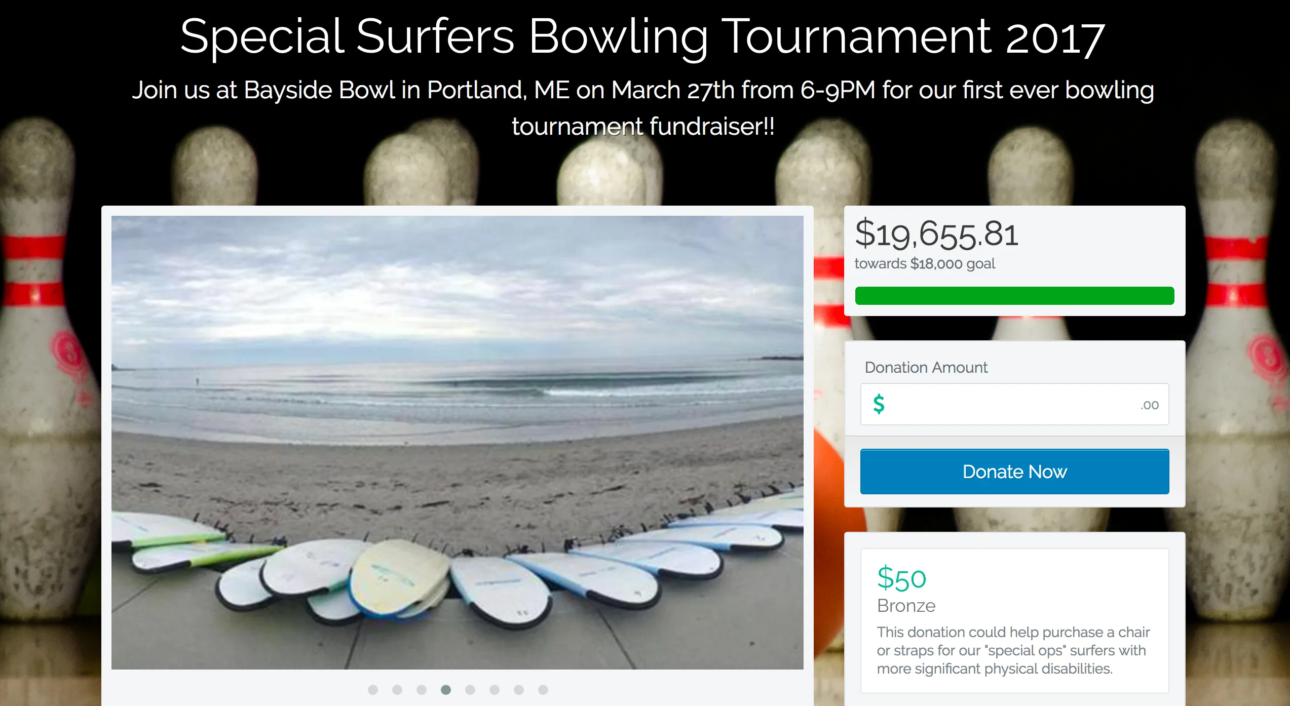 In partnership with Bayside Bowl in Portland, Maine, Special Surfers teamed up with Hopsie to host a bowling tournament aimed at raising $16,000 to help cover the costs of these surfing events.