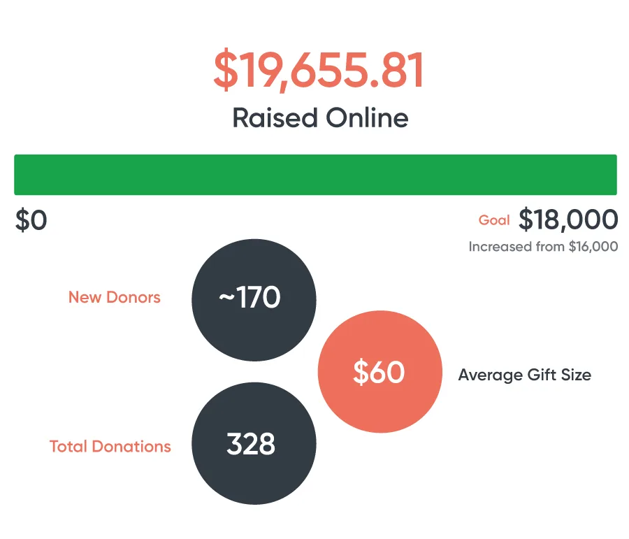 Through 328 individual gifts, the total amount raised was $20,655.57, with $19,592 coming through Hopsie online.